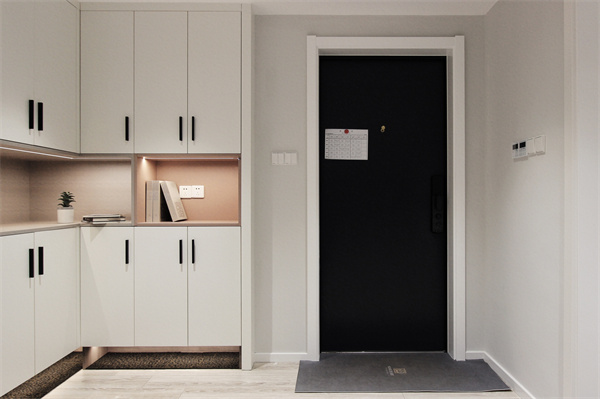 玄關側面,外墻內推,嵌入通頂鞋柜,收納家中鞋物,底部預留30cm挑空高度儲放換鞋凳。柜體中部鏤空臺面,擱置入戶小物件,內部頂上嵌入燈帶,微弱的的暖光,烘托出整個家的溫柔的氛圍感。