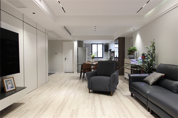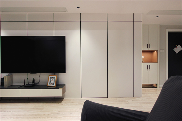 黑色皮革沙發和深色窗簾相互呼應,簡約時尚的單品搭配,在淺色木紋地板和白色漆面的空間里顯得新穎又大氣。客廳電視背景墻與女兒房臥室門結合為隱形門形式展現,整體性非常強,按塊面分割白色飾面板很好的隱藏了門的存在感。