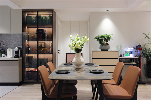 男屋主其中一大喜好就是收藏酒水,為了更好地展示出他的藏品,餐廳東邊也定制了一組展示柜。功能空間合理利用,與餐廳一體化設計,餐廳延伸至廚房及墻面,視覺上拉伸空間尺度,用對比反差營造匠心獨運。大理石餐桌和開放式的客廳融匯貫通,體現了業主的高端的審美與開放的文化含蘊,也增加了家庭成員的互動交流。