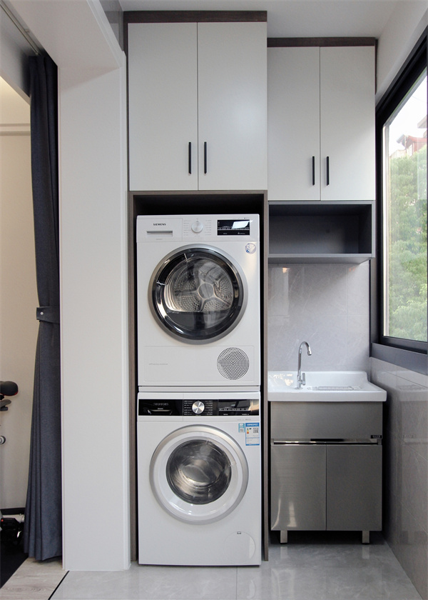 設計師再設計陽臺空間時最大程度合理利用空間,嵌入式洗衣機和烘干機疊加在一起節省空間,同時也滿足陽臺收納。