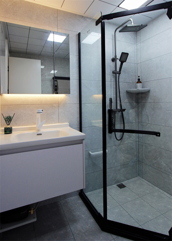 衛生間作為方寸之地,在追求實用功能的同時,黑色玻璃邊框淋浴房和浴盆柜時尚感也隨之up。客衛同樣采用干濕分離設計,玻璃做隔斷,隔絕水汽的同時空間上更加通透明亮。