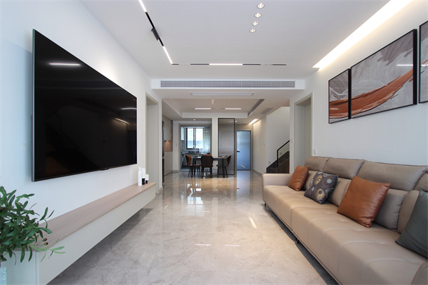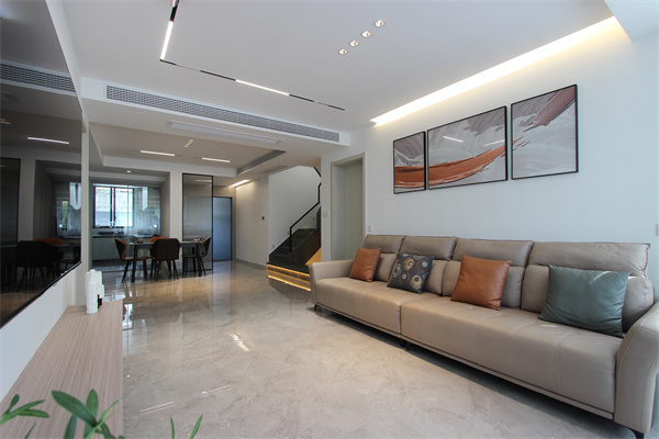 燈光是全屋的設(shè)計亮點,全屋采用無主燈設(shè)計,配合低飽和度色彩,凸顯個性與品味,簡約而時尚,可以承載更多時尚元素,同時讓家更寧靜溫馨。巧妙運(yùn)用洗墻燈,設(shè)計燈槽出光口,燈帶安裝在燈槽頂部,不僅照明整個墻面,打造見光不見燈的效果,還可提升空間氛圍。