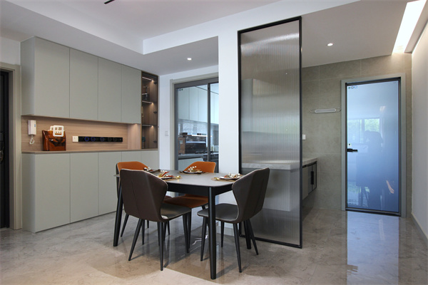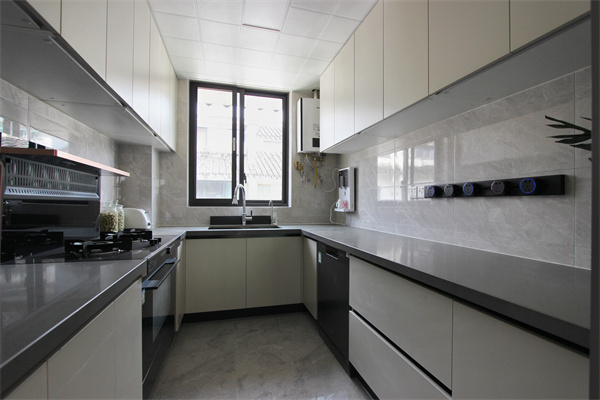 U型廚房設(shè)計,洗滌區(qū)、烹飪區(qū)及操作臺等空間劃分極其明確,操作動線無縫銜接。同樣設(shè)計可移動軌道插座,功能配置充足,滿足多個家電同時使用。廚房設(shè)置玻璃推拉門,做飯時關(guān)上就能有效隔絕油煙,還不影響廚房采光。