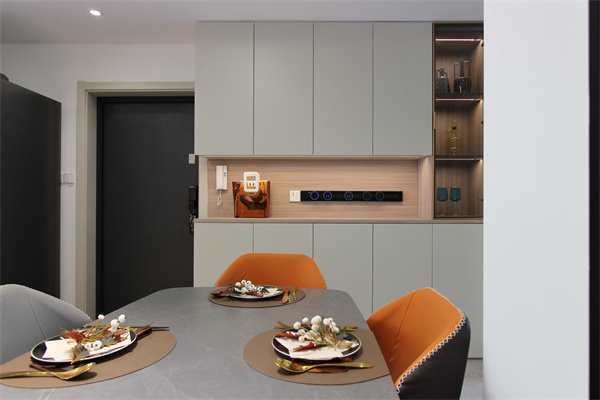 靠墻設(shè)計收納柜,既可做玄關(guān)柜也可做餐邊柜,立頂?shù)墓褡蛹瓤梢栽黾觾ξ锟臻g,又避免了頂面易積灰的問題。餐邊柜功能齊全,局部鏤空可放置鑰匙、裝飾物等,另外安裝可移動軌道插座,省去開墻煩惱,美觀又方便。