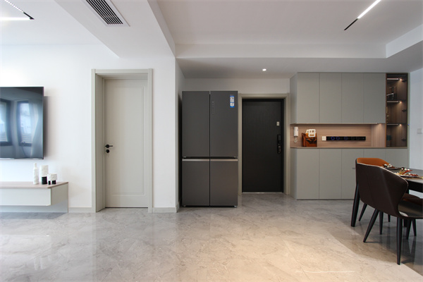 雙開門冰箱放置入戶門一側(cè),靠近餐廳區(qū)域,既方便買菜回家將物品放入冰箱,又方便下廚時候拿取菜品,也方便位于客餐廳的人員拿取冰箱里的零食飲料。