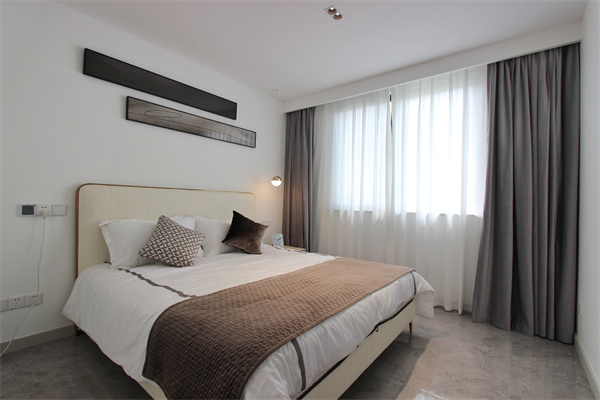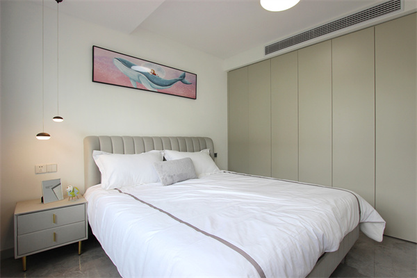 次臥設(shè)計比較女性化一點,弧形的灰色造型床頭,時尚感十足。粉色鯨魚裝飾掛畫,少女心滿滿。定制一整面墻的衣柜,保證了儲物空間,也滿足了次臥的收納需求。