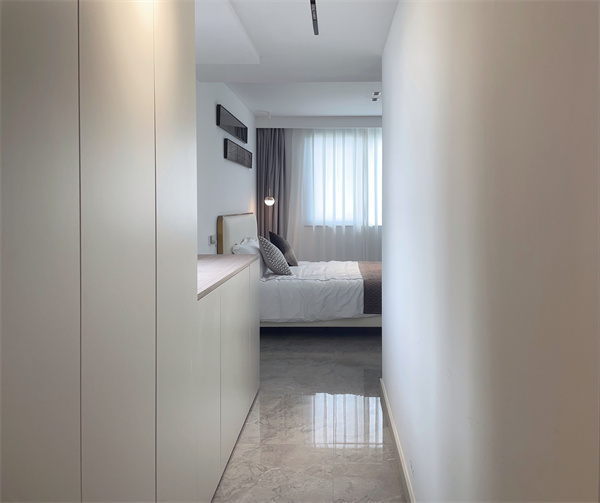 最巧妙的設(shè)計是主臥與主衛(wèi)過道空間充分利用,兩邊設(shè)計內(nèi)嵌式衣柜,將原本臥室的過渡空間布置成“衣帽間”,不僅裝飾了過道,還帶來了大量的儲物空間。