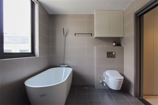 灰色系主衛(wèi)設(shè)計,高級又耐看。鏡柜將鏡子和收納合二為一,護(hù)膚品和化妝品都能整齊放置其中,保持臺面清清爽爽,減少雜亂。內(nèi)部空間經(jīng)過設(shè)計和精確的尺寸推敲,為屋主二人放下一個深泡浴缸。壁掛馬桶水箱入墻安裝,隔絕沖水噪音,還節(jié)省浴室空間。吊柜和馬桶之間還留空做了置物臺,可放置紙巾、手機(jī)、香薰等物品。