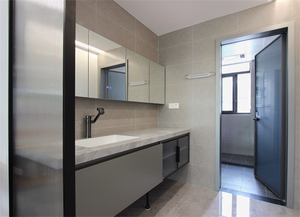 客衛(wèi)做了干區(qū)外置,用長虹玻璃做了半墻隔斷,避免尷尬的同時也不會影響通透采光。臺盆下方抽屜大空間的設(shè)計,有效收納衛(wèi)浴間不常用物品,加之右側(cè)長虹玻璃設(shè)計的柜門,收納功能強(qiáng)大,視覺上更整潔、更美觀。內(nèi)部安裝折疊隔斷簾,打造隱形簡潔浴室。墻面多處采用壁龕設(shè)計,不占用沐浴區(qū)空間,放沐浴用品等都非常方便。