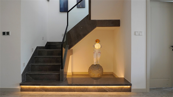 樓梯采用大理石臺階,十分美觀大氣。臺階下的燈帶,在解決照明問題的同時,讓樓梯更加有造型感與藝術(shù)感。樓梯間的燈光處理也是本案的一大亮點,光線籠罩宇航員擺件,讓人不自覺便將目光轉(zhuǎn)到這一重點上,又給空間增添了幾分時尚的感覺。