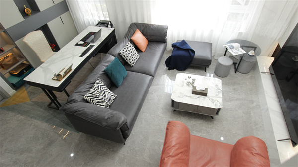 客廳深灰皮質沙發,有著安定平和的內斂美感,搭配不同跳躍的色彩做點綴,大理石臺面茶幾,整個客廳變得非常現代,且不乏享受生活的浪漫質感。大面積的落地窗,裝上紗簾,為客廳提供了充足的采光,結合現代簡約的沙發茶幾,營造出了一個舒適明亮的空間氛圍。