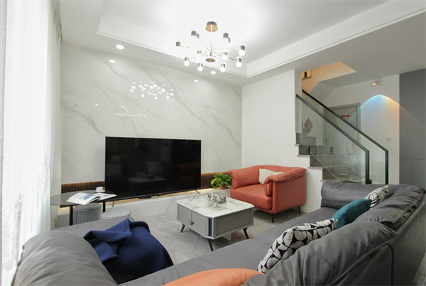 電視背景墻采用整面大理石裝飾,一把經典橙紅色皮質單椅,干凈利落的線條,沒有任何冗余的裝飾,在吊燈的層疊光影下,賦予空間靈動之美。