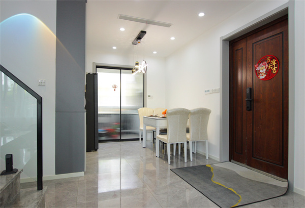 全開放式客餐廳空間布局,張弛有度的空間動線,讓視覺感官更加開闊,搭配上以一種米白色來拉開。嵌入式餐邊連體柜,冰箱內置,中部鏤空設計放置小電器,裝飾品等,收納空間加倍。