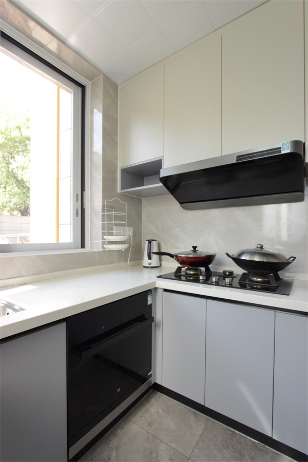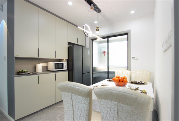 廚房整個空間采取淺灰的墻面與白色操作臺面,使的空間更加明亮優雅。L型廚房布局,櫥柜+吊柜的組合設計,小小空間也滿足了家人烹飪與儲物需求。地面是灰色大理石,廚房移門則采用了長虹玻璃,打造了“見光不見影”的視覺效果,并且起到了油煙外泄的功能,也讓廚房與餐廳區域分隔開來。