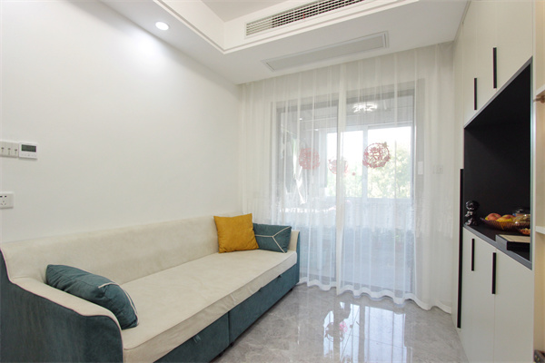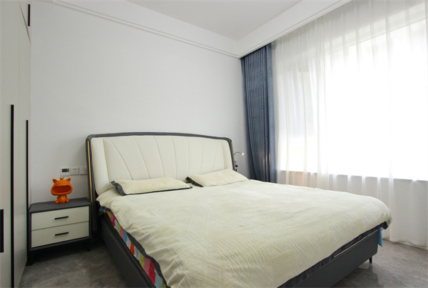 大面積落地窗保持空間的通透性,中軸對稱的床頭布局強調了空間的整體性,創造出一個舒適安寧的休憩空間。隱形把手設計的整體衣柜,簡潔的回字型吊燈,巧妙地遮擋住空調只留下出風口,簡單線條設計豐富空間層次感。