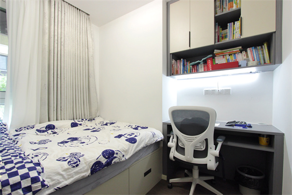 在整個空間里,通過不同質感的材質運用與搭配將現代風打造得淋漓盡致,讓休閑成為這個空間的一大亮點。次臥空間采用吊柜+書桌傳統組合設計,使得空間具有功能性,靠窗布局,帶來舒適明亮光線。床對面做了通頂衣柜,一側中部留空作為展示,既美觀又超省空間。