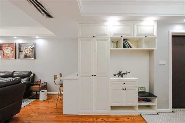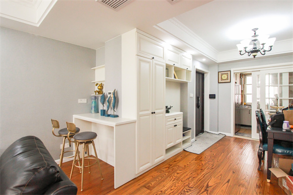 玄關柜面既有收納區也有展示區,鞋柜旁安排了連體換鞋凳,不必彎腰換鞋,注重美觀的同時,增加了生活實用性。柜體整體定制并在墻后做了一個小吧臺,用作日常休閑。