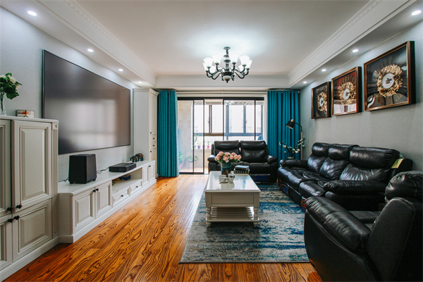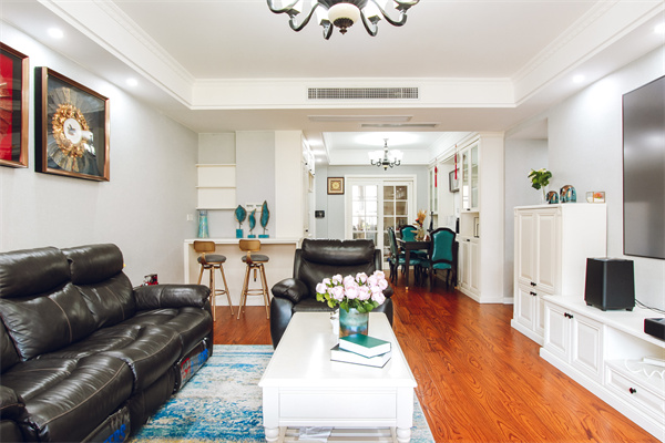 客廳沒有過多的吊頂修飾,流暢的線條,墻壁兩側用射燈點綴,有質感的黑色皮質沙發,懷舊的美式掛畫。白色電視柜與黑色沙發相對,烘托美式鮮明格調。