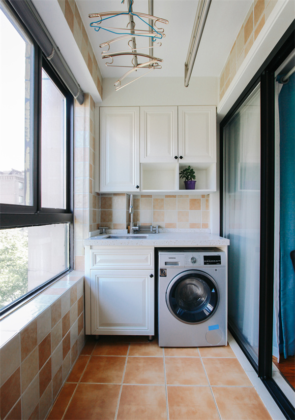 陽臺兩側皆有安裝頂底相接的收納柜,外立面看起來和諧統一,既可作休閑花藝區,亦可當居家洗衣區。封閉式陽臺墻面與地面使用防水瓷磚,色彩與室內地板相襯,暗留設計師的巧思。