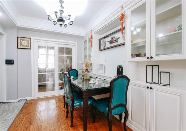 玄關入門即是餐廳,餐廳一邊做了一排矮柜,注入收納理念。餐桌靠墻而立,節省空間的情況下也能滿足日常用餐需求。展示柜藏酒亦或是藏品,都是品味的象征。設計師利用入戶走廊和石膏吊頂將客餐廳空間明確劃分,色彩搭配毫不含糊,白色調通透大方。