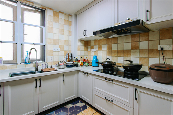 廚房格局比較板正,臺面采用的是L形格局,讓本就寬敞的空間更加實用,墻面與陽臺使用同款防水瓷磚,防水又耐臟。左側定制收納柜,貼合冰箱尺寸,將蒸箱烤箱嵌入柜中,不浪費每一個空間。