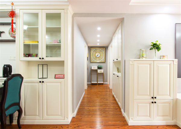 通往內室的走廊,狹長而神秘,亦有一種移步換景之感。點線面的構成,嚴謹的線條比例,白色為主調,裝飾柜與掛畫將通道變得更加完整。