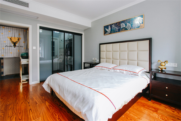 次臥整體為灰白色調,去掉了過于沉重的黑色,使空間更加輕快。