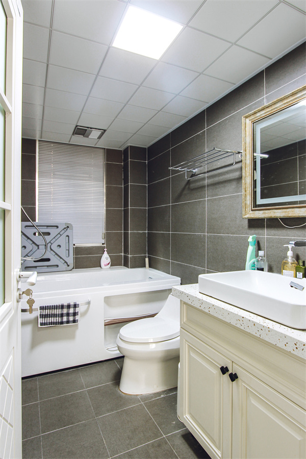 主臥內衛帶浴缸,極致的享樂主義,復古的黑灰色瓷磚,使空間更有格調。臺上盆的設計,使洗漱用品有處可放。復古的做舊款臺面鏡,渲染了一絲古典美式的韻味,主臥的套房設計將生活的基本需求包含于此。