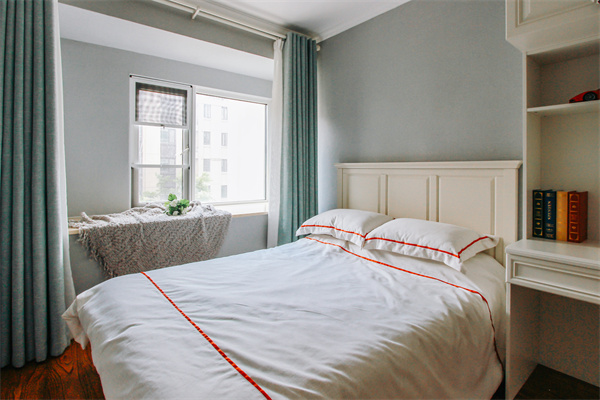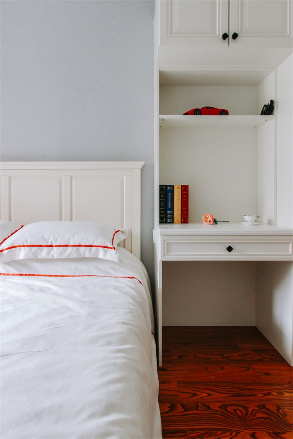 L形定制書柜位于床頭一角,給進門空間增添了一絲空間層次感。桌柜一體,展現了次臥的另一個功能——書房,書桌高度符合人體工程學,在疲累的工作后,柔軟的單人床即刻便可用于休憩。