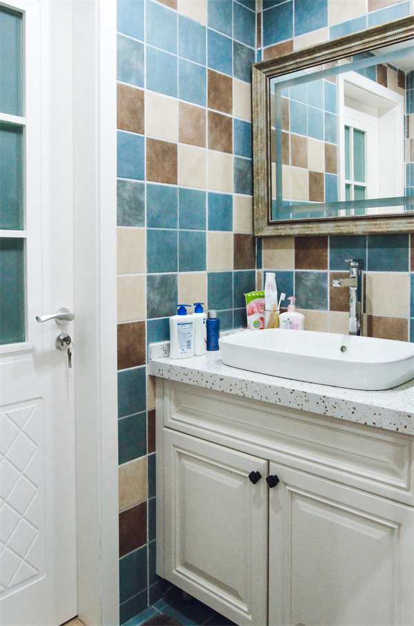 公共衛生間干濕分離,干區用半門簾遮擋,色彩豐富的墻磚,讓這個不足一平米的小空間有了生機。