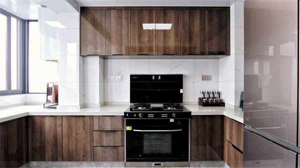 U形廚房空間通透明亮,整體空間利用空間減法,打造足夠的烹飪空間。廚房采用集成灶,洗碗機內嵌柜體中,節約空間成本,也讓櫥柜看起來更加統一。