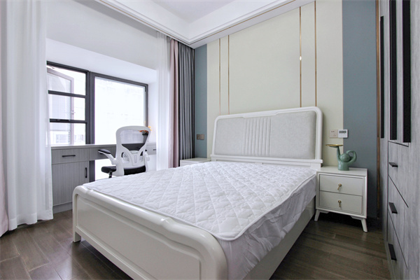 次臥即是兒童房,采用的是在視覺上較為舒適的淡雅色調,整體柔和。淺色調的搭配,兼顧著韻味與美感,以輕盈的姿態,流露著高雅的氣質。灰色衣柜增加臥室的層次,既有過渡空間的作用,又實現了空間的交流融合。