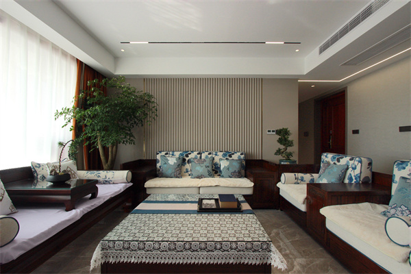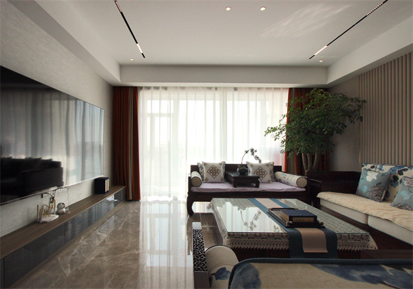 全屋無主燈設計,通過筒燈+軌道燈的組合搭配打造空間光影層次感。桌上的盆景、燈光與綠意交織,中式風格的沙發,讓客廳呈現出更具有東方底蘊的一面。