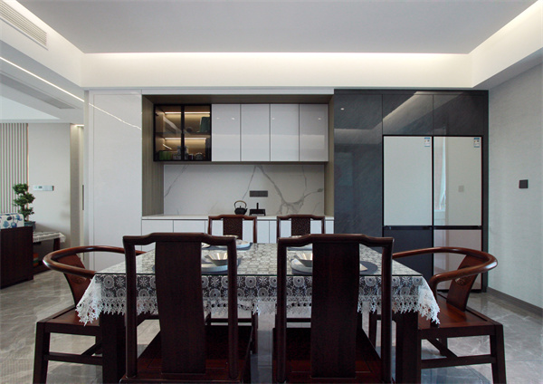 與客廳相連的餐廳空間,整體在懸浮頂燈帶的映射下,形成古而不拙的輪廓。中式原木材質餐桌椅,搭配精致的餐具擺飾,營造出一種極盡雅致的空間,盡顯中式禪意。