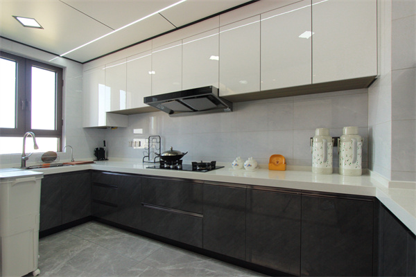 采用U型櫥柜布局,將空間利用達到了最大化,不僅儲物充足,操作也是十分靈活便捷。白色吊柜搭配黑色地柜,豐富色彩層次,顯得簡單又大方。