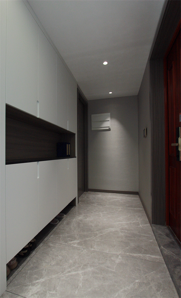 走廊過道空間安裝筒燈,通過均勻的照明讓整個空間顯得明亮寬敞。盡頭擺放裝飾畫,不僅起到裝飾作用,還給家帶來溫馨感。沿著過道側邊定制到頂的儲物柜,可以把囤積的雜物、家用工具等物品存放在這里。