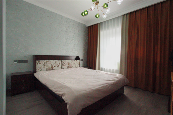 主臥背景墻選用淡雅的色彩,讓人感覺到一種清新自然的視覺感,既營造了高級感的居住氛圍,又強調一脈相承的設計初衷。