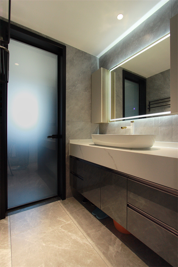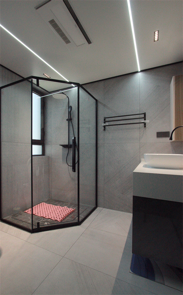 主衛利用透明玻璃做干濕分離設計,增加了浴室透光感。通鋪灰色瓷磚,整體空間會更加耐臟美觀。頂面安裝燈帶,可以增加頂部的層次感,形成一種虛實對比,動靜結合的效果。