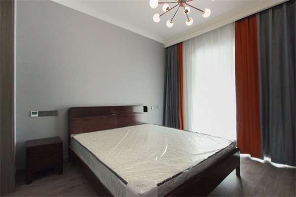 以灰色調打造的次臥,空間沒有太多的元素,布藝材質的窗簾應用以及深淺色彩的對比,讓睡眠空間兼具舒適感和時尚感。內斂古樸端莊額中式雙人床以及床頭柜,既有古色古香的神韻,又有簡潔利落的現代感。