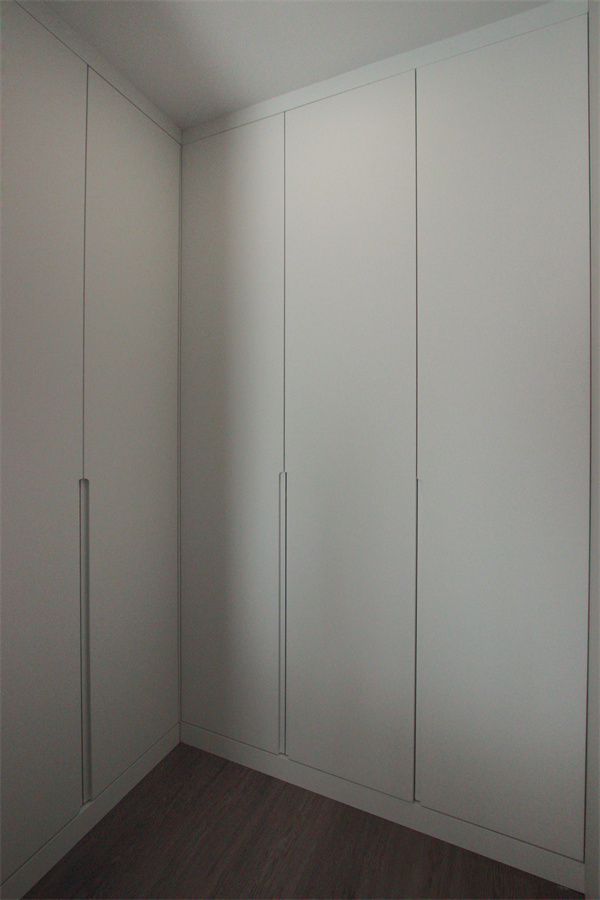 為了將空間最優化利用,把內凹的雞肋空間納入次臥,打造U型步入式衣帽間,滿足業主收納需求。衣帽間定制一組到頂白色無把手儲物柜,可收納衣物、被子包包等物品。