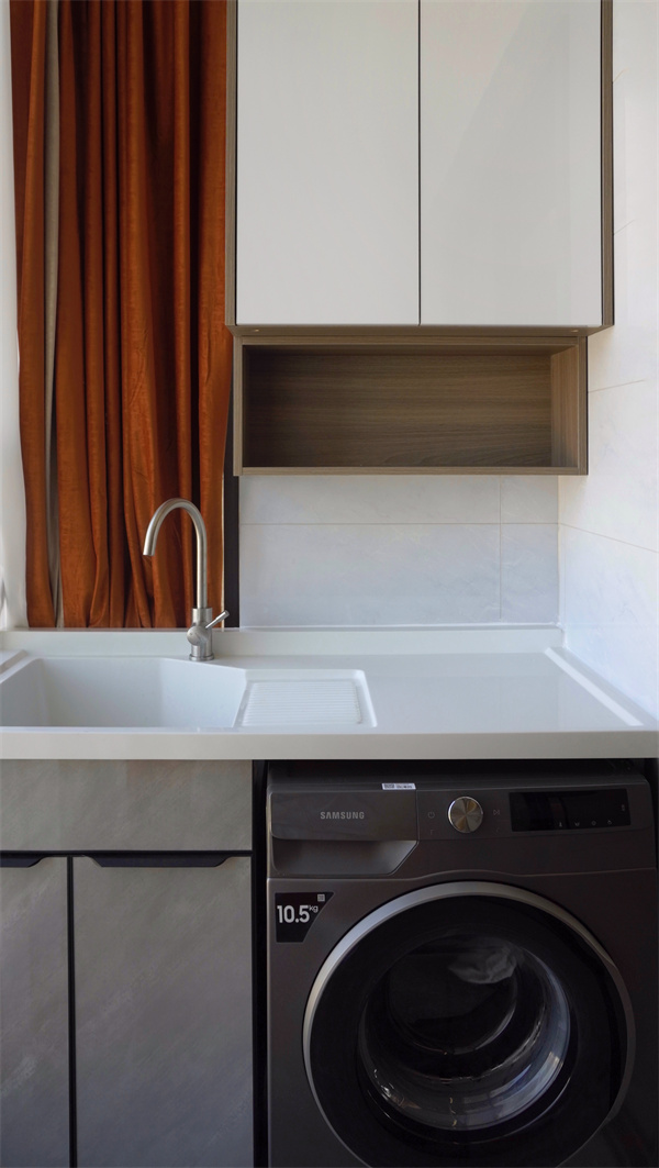 陽臺空間有限,一側定制陽臺柜,將洗衣機內嵌其中,方便實用。上方做吊柜,可以將洗衣液、清潔用品等放進去。即使不作為洗衣區,日常收納也非常實用。