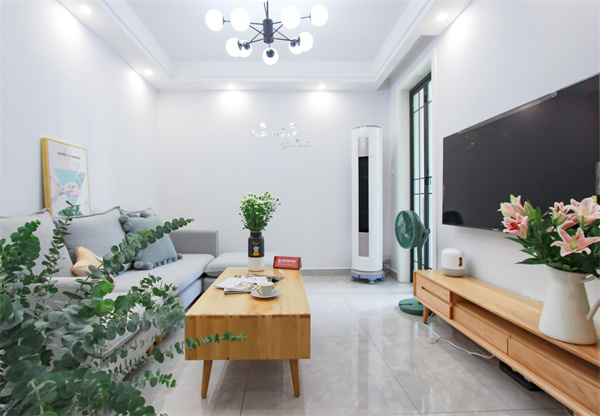 客廳用流暢的線條進行分區,白色干凈純粹,隨性的自然元素點綴,使空間極富生機。灰色布藝沙發柔軟而清新,原木色茶幾和電視柜與整體色彩呼應。