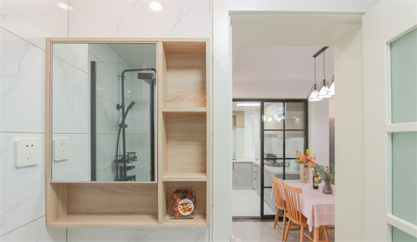 與整體空間統一的原木色浴室柜,搭配黑框獨立淋浴房,簡約、純凈。