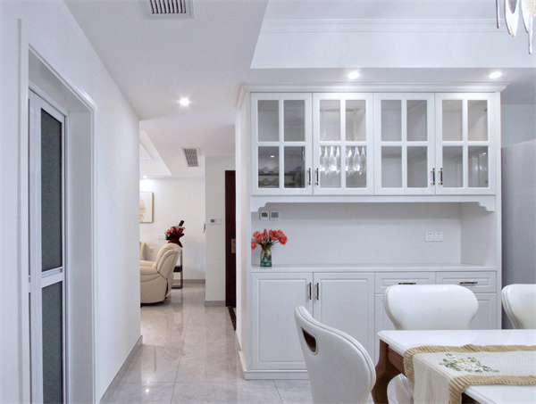 餐邊酒柜充滿美式田園風情調,透明柜門內整齊擺放各類藏酒、杯具,收納也是僅僅有條。