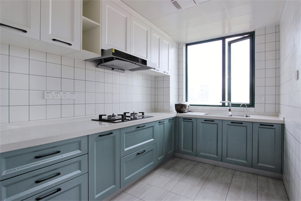 廚房體現了生活百味,一個家的生活氣息盡顯于此。純凈的白色吊柜,與清新的水藍色地柜搭配,清雅別致,活力十足。操作區與電器區分別設置于灶具兩側,讓廚房的干與濕得以分離,既安全,更方便。