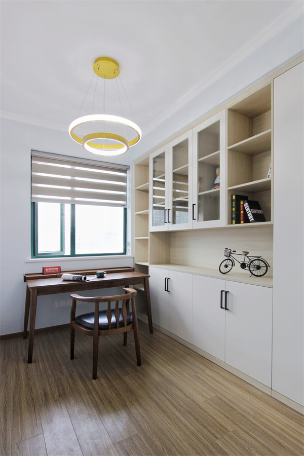書房是朝北的一個長形空間的利用,一側留白,另一側做整面書柜,讓書桌的空間得到更多自然光的照拂。開放格放置常用的書籍、擺件,透明柜門更具有展示功能,書籍的整齊擺放,讓人更加舒心。