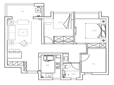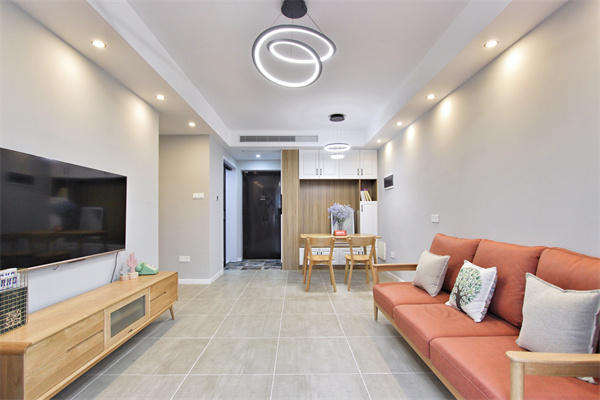 主體為客餐廳一體化,灰色地磚通鋪,點綴白色美縫線條,簡約吊頂,利用筒燈增加空間層次,營造舒適暖居。