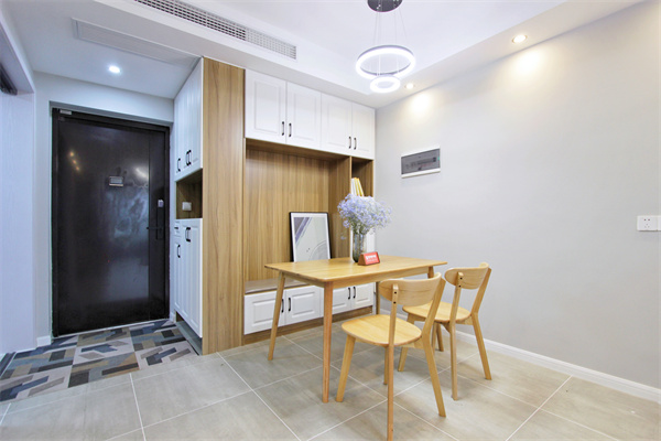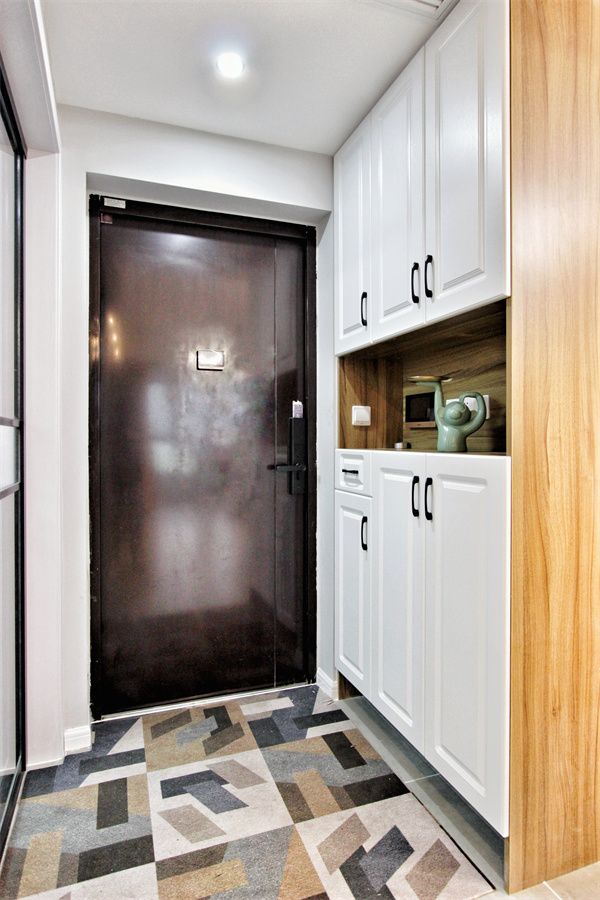 入戶為短廊式玄關,筒燈照明,不做花哨的雕刻,呈現簡明的視覺效果。經典的白色玄關柜,搭配黑色把手,增加抽屜,便捷收納,中腰留空,既可置物,也能作為換鞋扶手。