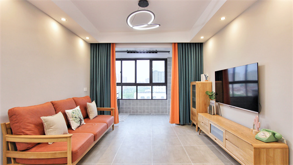 客廳空間利用原木以及大量橙色,營造溫暖舒適的空間氛圍。原木矮柜加上邊斗柜,組合為電視柜,木料元素為客廳空間塑造清新自然溫度。