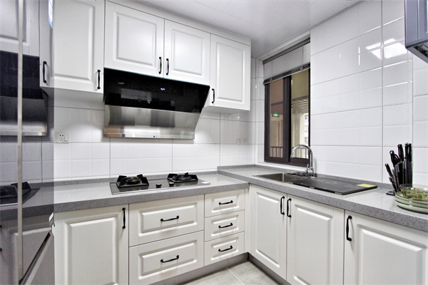 廚房選用的是白色模壓柜門,塑造一種田園小資風格,一側留出足夠雙開門冰箱嵌入的空間,使廚房空間更加整體。利用吊柜遮擋油煙機管,另一側不做吊柜處理,使廚房空間更加通透,以白為主,純凈宜人。